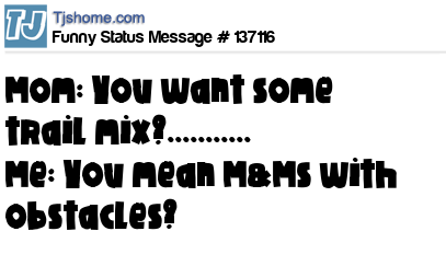 X Mom: You want some trail mix?........... Me: You mean M&Ms with obstacles?