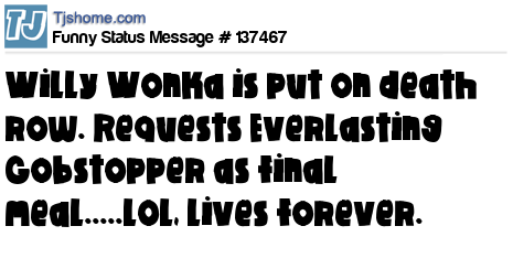 X Willy Wonka is put on death row. Requests Everlasting Gobstopper as final meal.....LOL, Lives forever.
