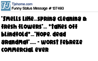 X "Smells like...spring cleaning & fresh flowers"... *takes off blindfold*..."Nope, dead grandma!"..... - worst Febreze commercial ever