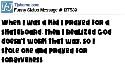 X says When I was a kid I prayed for a skateboard, then I realized God doesn't work that way, so I stole one and prayed for forgiveness