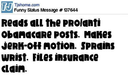 X Reads all the pro/anti Obamacare posts. Makes jerk-off motion. Sprains wrist. Files insurance claim.