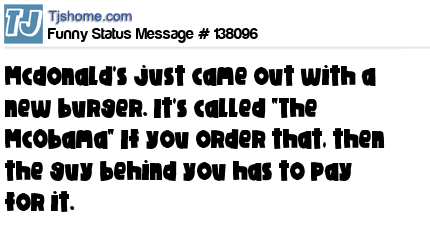 X says Mcdonald's just came out with a new burger. It's called "The McObama" If you order that, then the guy behind you has to pay for it.