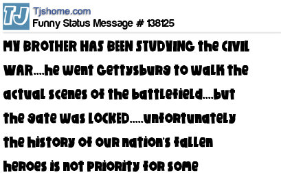 X says MY BROTHER HAS BEEN STUDYING the CIVIL WAR....he went Gettysburg to walk the actual scenes of the battlefield....but the gate was LOCKED.....unfortunately the history of our nation's fallen heroes is not priority for some leaders.. ..MANY believe it is mo