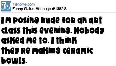 X I’m posing nude for an art class this evening. Nobody asked me to. I think they’re making ceramic bowls.