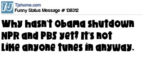 X Why hasn't Obama shutdown NPR and PBS yet? It's not like anyone tunes in anyway.