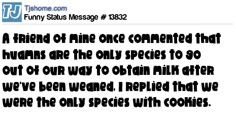 X A friend of mine once commented that huamns are the only species to go out of our way to obtain milk after we've been weaned, I replied that we were the only species with cookies.