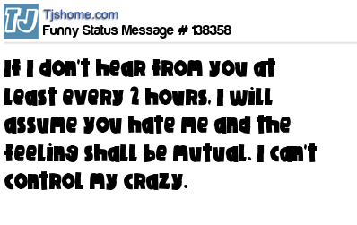 X says If I don't hear from you at least every 2 hours, I will assume you hate me and the feeling shall be mutual. I can't control my crazy.