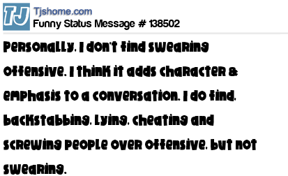 X says Personally, I don't find swearing offensive. I think it adds character & emphasis to a conversation. I do find, backstabbing, lying, cheating and screwing people over offensive, but not swearing.
