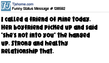 X says I called a friend of mine today. Her boyfriend picked up and said "she's not into you" the hanged up. Strong and healthy relationship that.