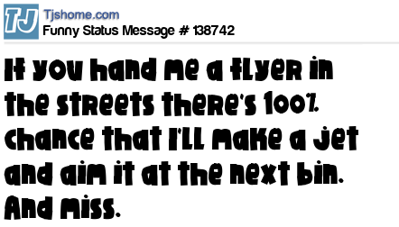 X says If you hand me a flyer in the streets there's 100% chance that I'll make a jet and aim it at the next bin. And miss.