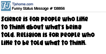 X says Science is for people who like to think about what's being told. Religion is for people who like to be told what to think.