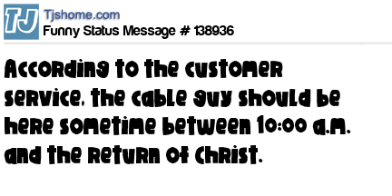 X says According to the customer service, the cable guy should be here sometime between 10:00 a.m. and the return of Christ.