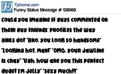 X  Could you imagine if guys commented on their guy friends' profiles the way girls do? "Bro, you look so handsome" "Looking hot, man!" "OMG, your jawline is cray" "Ugh, how are you this perfect dude? I'm jelly" "sexy much?!"