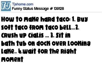 X How to make hard taco: 1. Buy soft taco from taco bell...2. Crush up Cialis ... 3. Sit in bath tub on dock over looking lake.. 4.wait for the right moment