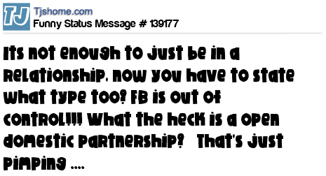 X says Its not enough to just be in a relationship, now you have to state what type too? FB is out of control!!! What the heck is a open domestic partnership? That's just pimping ....