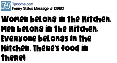 X Women belong in the kitchen. Men belong in the kitchen. Everyone belongs in the kitchen. There's food in there!