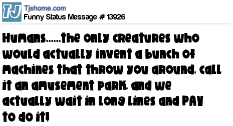 X says humans......the only creatures who would actually invent a bunch of machines that throw you around, call it an amusement park, and we actually wait in long lines and PAY to do it!