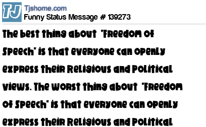 X  The best thing about  "Freedom of Speech" is that everyone can openly express their Religious and Political views. The worst thing about  "Freedom of Speech" is that everyone can openly express their Religious and Political views.