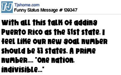 - # 116862 With talk of Puerto Rico becoming the next state, we should consider adding three states. Since 53 is a prime number, we would be "one nation, indivisible".