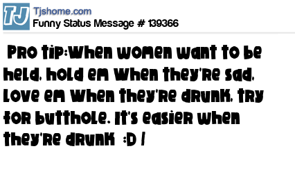 - # 139365 Pro tip:When women want to be held, hold em When they're sad, love em When they're drunk, try for butthole. It's easier when they're drunk :D /
