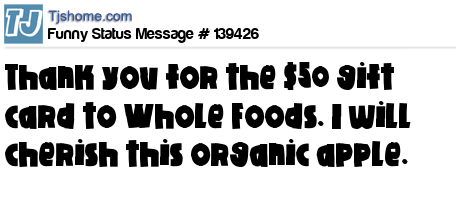X Thank you for the $50 gift card to Whole Foods. I will cherish this organic apple.