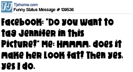 X Facebook: "Do you want to tag Jennifer in this Picture?" Me: Hmmmm. does it make her look fat? Then yes, yes I do.