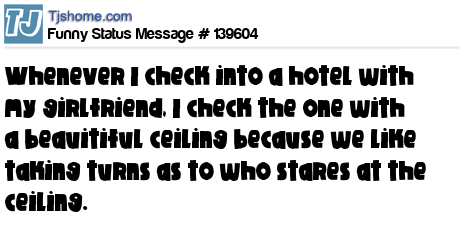 X says Whenever I check into a hotel with my girlfriend, I check the one with a beauitiful ceiling because we like taking turns as to who stares at the ceiling.
