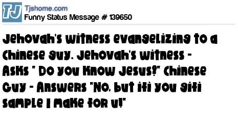 X says Jehovah's witness evangelizing to a Chinese guy. Jehovah's witness - Asks " Do you know Jesus?" Chinese Guy - Answers "No, but ifi you gifi sample I make for u!"