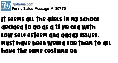 X says It seems all the girls in my school decided to go as a 21 yr old with low self esteem and daddy issues. Must have been weird for them to all have the same costume on