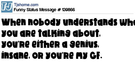 X says When nobody understands what you are talking about, you're either a genius, insane, or you're my GF.