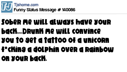 X says Sober me will always have your back….Drunk me will convince you to get a tattoo of a unicorn f*cking a dolphin over a rainbow on your back.