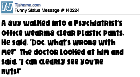 X says A guy walked into a Psychiatrist's office wearing clear plastic pants. He said, "Doc, what's wrong with me?" The doctor looked at him and said, "I can clearly see you're nuts!"