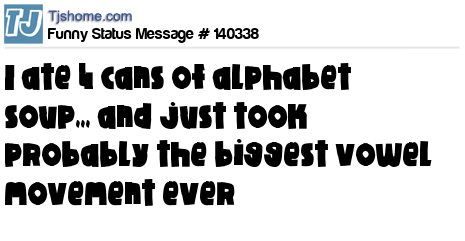 - # 119887 I ate 4 cans of alphabet soup,,, and just took probably the biggest vowel movement ever.