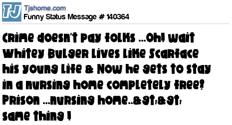 X says Crime doesn't pay folks ...Oh! wait Whitey Bulger lives like Scarface his young life & Now he gets to stay in a nursing home completely free? Prison ...nursing home..>> same thing !