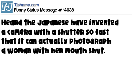 - # 9751 I heard the Japanese have invented a camera with a shutter so fast that it can actually photograph a woman with her mouth shut! Isn't that amazing? Before you show your hurt feelings, just keep in mind THIS IS A JOKE, no one can create a camera that FAST