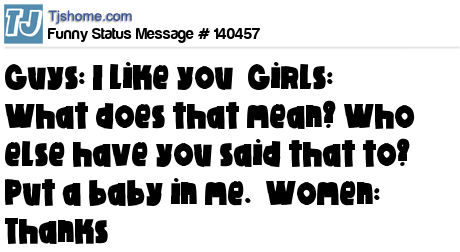 X says Guys: I like you Girls: What does that mean? Who else have you said that to? Put a baby in me. Women: Thanks