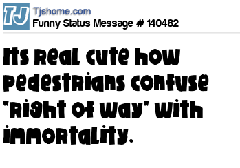 - # 163240 It's amazing how many pedestrians confuse right-of-way with immortality.