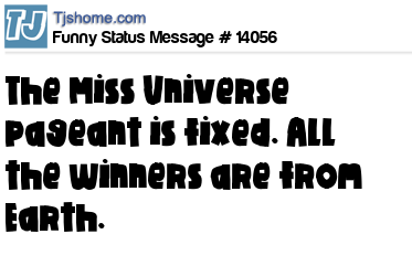 - # 103868 The Miss Universe Pageant is obviously rigged. The winner is always from Earth.