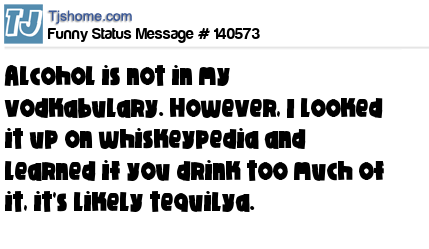 X says Alcohol is not in my vodkabulary. However, I looked it up on whiskeypedia and learned if you drink too much of it, it's likely tequilya.