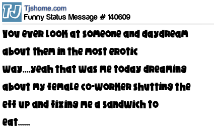 X says You ever look at someone and daydream about them in the most erotic way....yeah that was me today dreaming about my female co-worker shutting the eff up and fixing me a sandwich to eat......