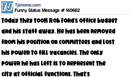 X says Today they took Rob Ford's office budget and his staff away. He has been removed from his position on committees and lost his power to fill vacancies. The only power he has left is to represent the city at official functions. That's actually the one I wou