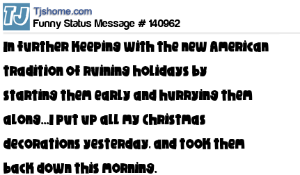 X In further keeping with the new American tradition of ruining holidays by starting them early and hurrying them along...I put up all my Christmas decorations yesterday, and took them back down this morning.