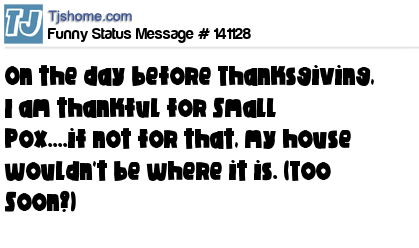 X says On the day before Thanksgiving, I am thankful for Small Pox....if not for that, my house wouldn't be where it is. (Too Soon?)
