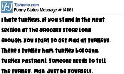 X says I hate turkeys. If you stand in the meat section at the grocery store long enough, you start to get mad at turkeys. There’s turkey ham, turkey bologna, turkey pastrami. Someone needs to tell the turkey, ‘man, just be yourself.