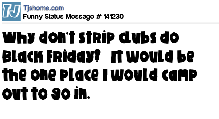 X Why don't strip clubs do Black Friday? It would be the one place I would camp out to go in.