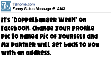 X  It's "Doppelbanger Week" on Facebook. Change your profile pic to naked pic of yourself and my partner will get back to you with an address.