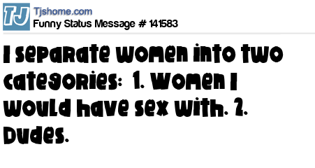 - # 104364 I separate women into two categories: 1. Women I would have sex with. 2. Dudes.