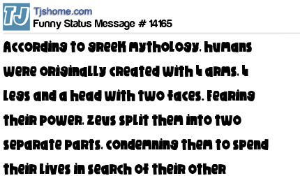 - # 114604 “According to greek mythology, humans were originally created with 4 arms, 4 legs and a head with two faces. Fearing their power, zeus split them into two separate parts, condemning them to spend their lives in search of their other halves.”