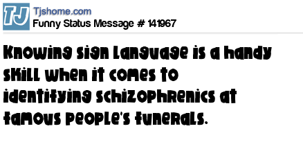 X says Knowing sign language is a handy skill when it comes to identifying schizophrenics at famous people's funerals.