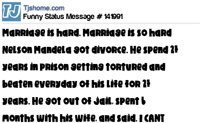 - # 161170 Marriage is hard. Marriage is so hard Nelson Mandela got divorced. He spend 27 years in south african prison getting tortured and beaten everyday for 27 years straight. He got out of jail, was 6 months with wife, and said "i cant take this s#it"